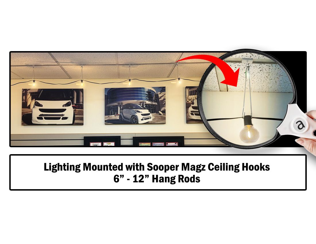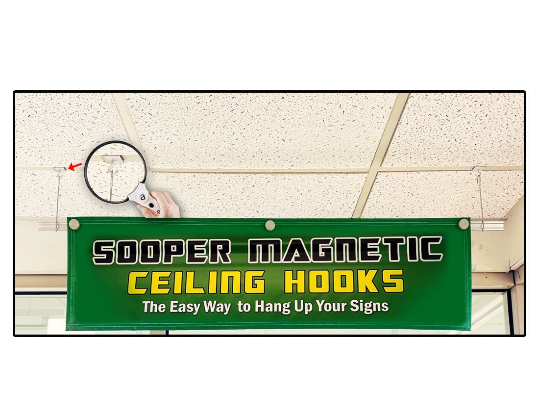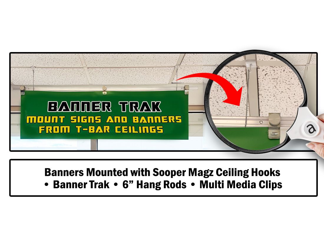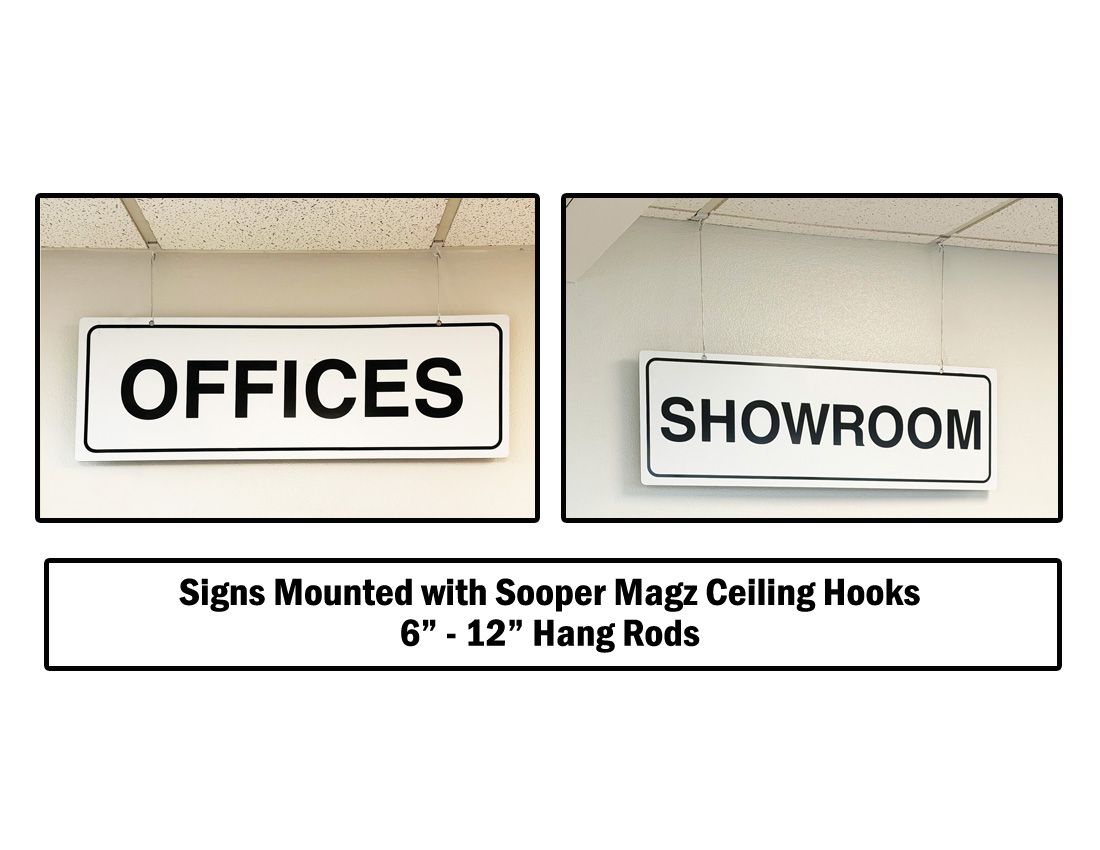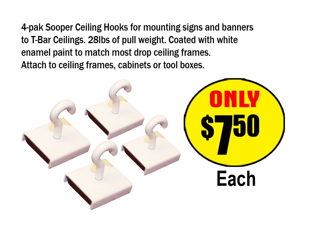 Designed for use with T-Bar dropped ceilings. Can use on any metal surface. Powder coated white to match the T-Bar. Hang signs anywhere from the ceiling.